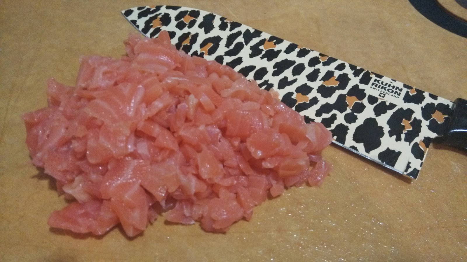 將三文魚切粒, 備用