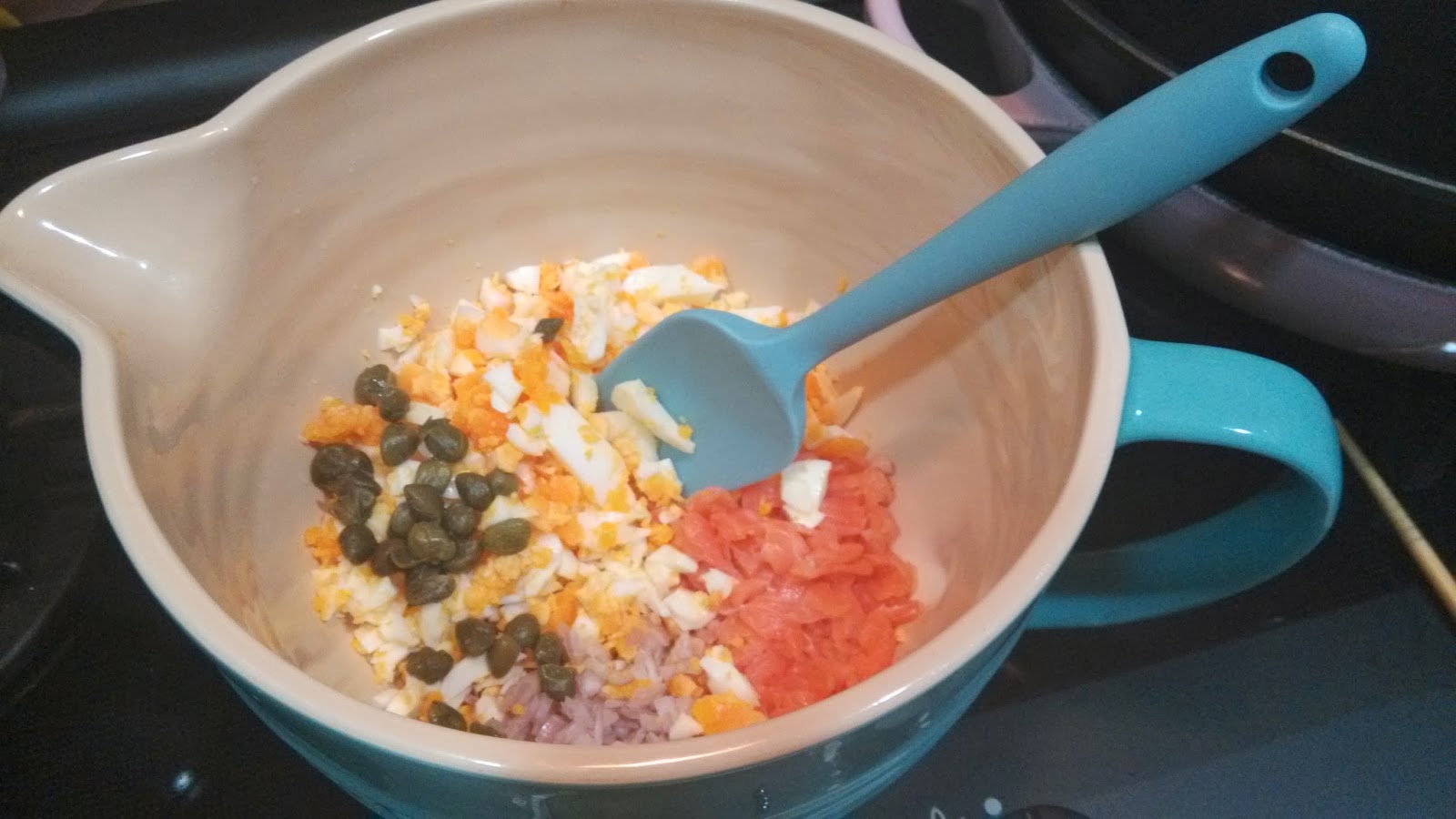 放入乾蔥碎, 煙三文魚粒及雞蛋碎,