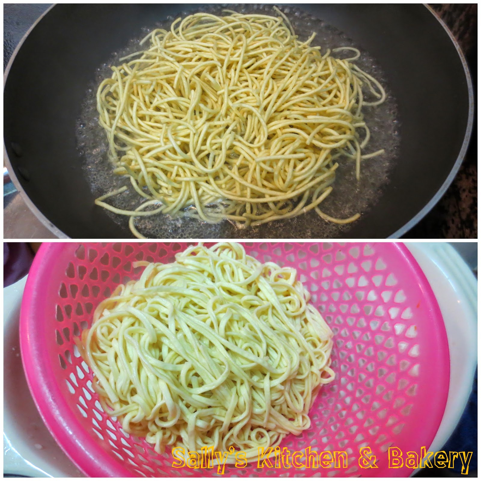 1. 先煲滾水,將伊麵灼至軟身(約半分鐘),撈起隔水備用。