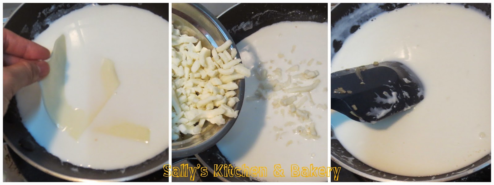 8. 用小煲或小鑊煮芝士汁,先倒進牛奶,加入片裝芝士及¾馬蘇尼拉芝士慢火煮溶,邊煮邊攪拌,煮溶芝士後下鹽調味,熄火。