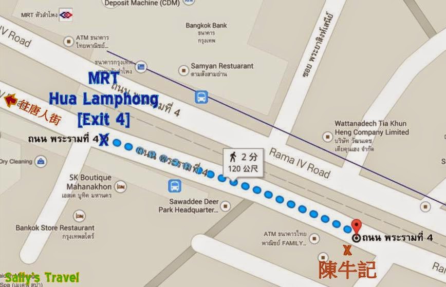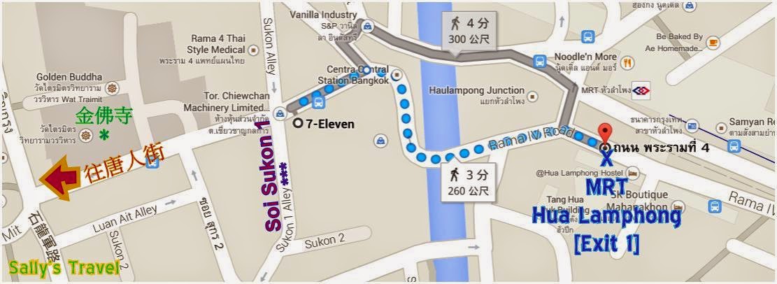 MRT Hua Lamphong Exit 4,沿大馬路,約3-4分鐘。