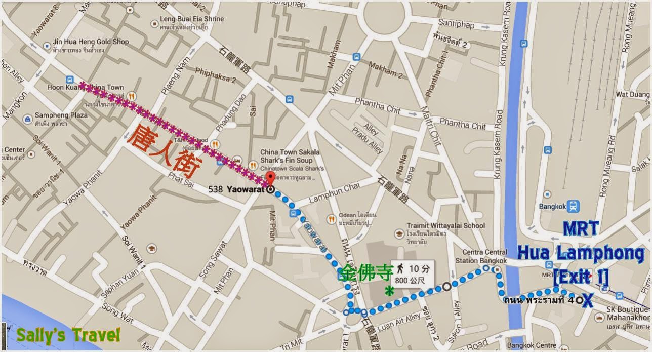 MRT Hua Lamphong Exit 1,向唐人街方向行,經過7-Eleven旁邊的小巷,由MRT站行約5分鐘。