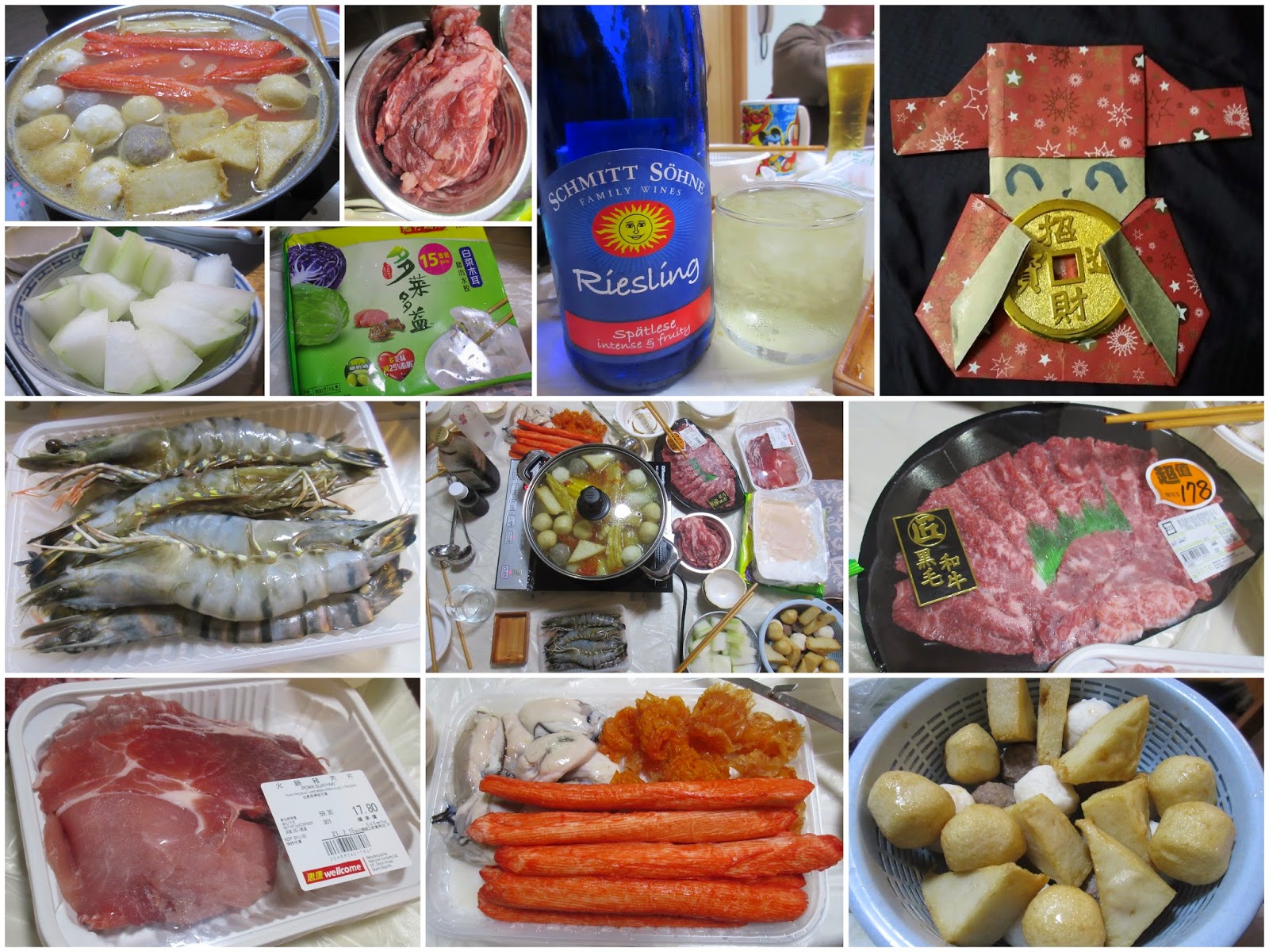 預備了不少美食: 大魚蛋/丸類/腸仔,大蝦,鮑魚,扇貝,雞翼,豬頸肉,牛仔骨,香草羊架,粟米,蕃薯,雜菇,咖哩魷魚,厚燒2磅安格斯肉眼扒,生菜青瓜沙律