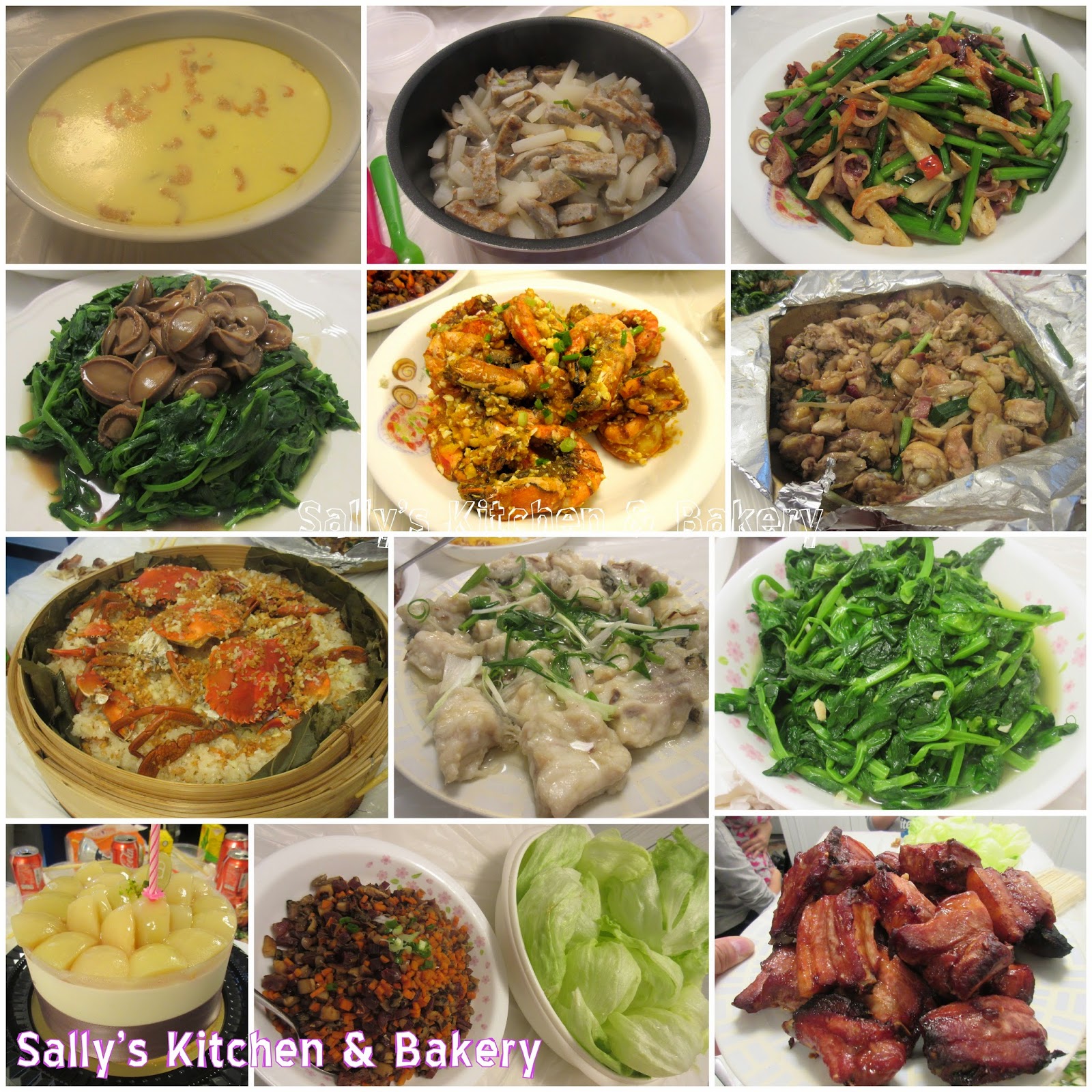 瑤柱金鈎蒸水蛋,蘿蔔魚鬆,小炒皇,炆鮑魚伴豆苗,黃金蝦,銅盤雞,籠仔蟹蒸糯米飯,蒜香陳皮蒸斑腩,清炒豆苗,粒粒金蠔生菜包,焗南乳骨,白桃生日蛋糕