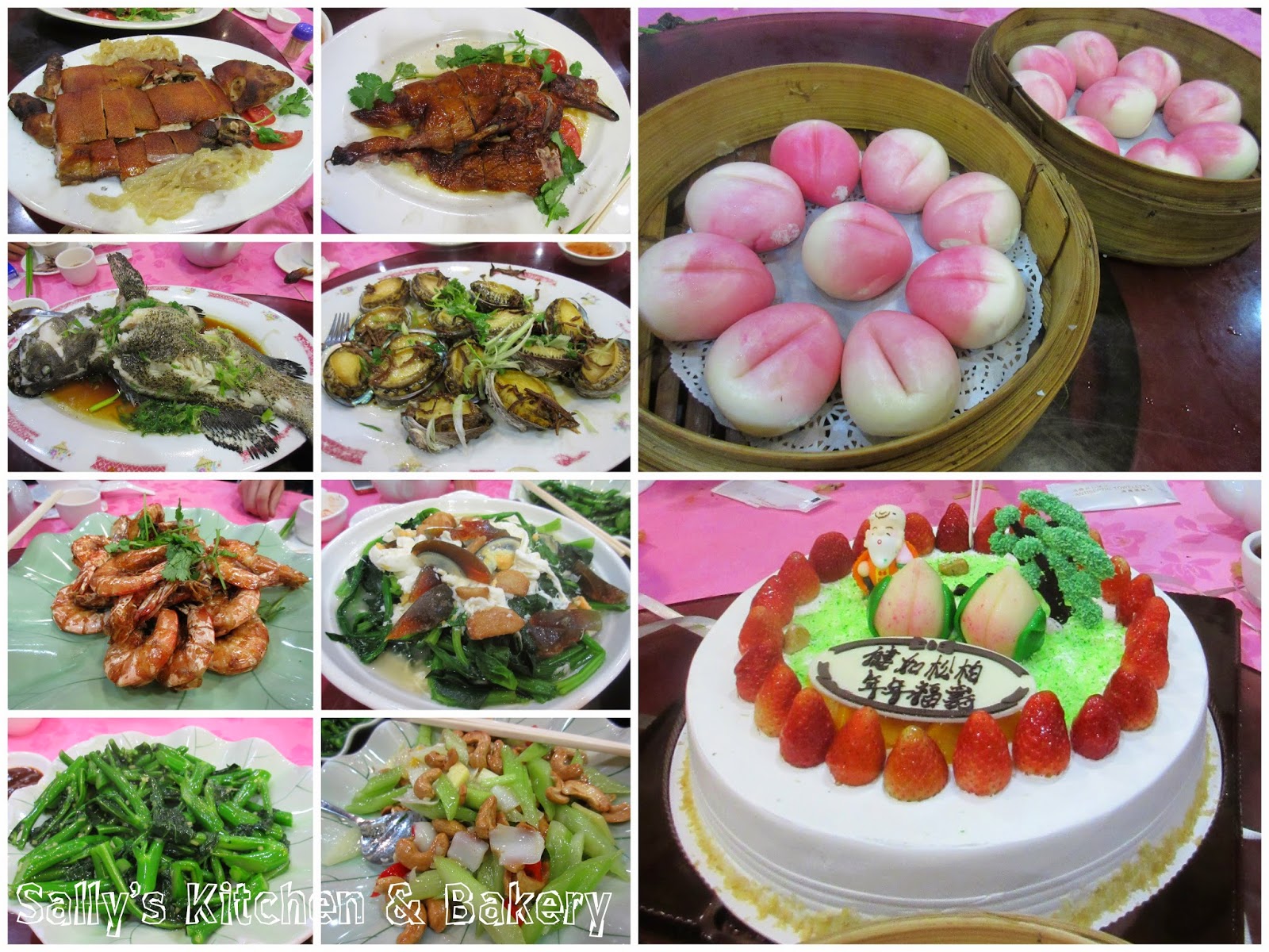 脆皮乳豬,美味燒鵝,清蒸海斑,果皮飽魚,豉油皇大蝦,金銀蛋時蔬,薑汁芥蘭,腰果炒西芹,長壽伊麵,精美壽桃包,生日蛋糕